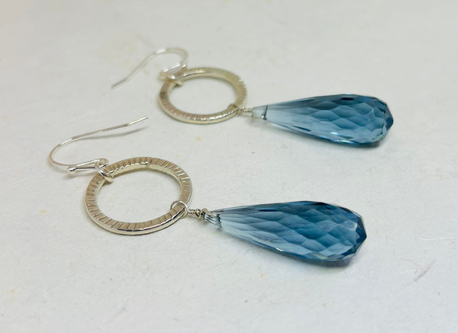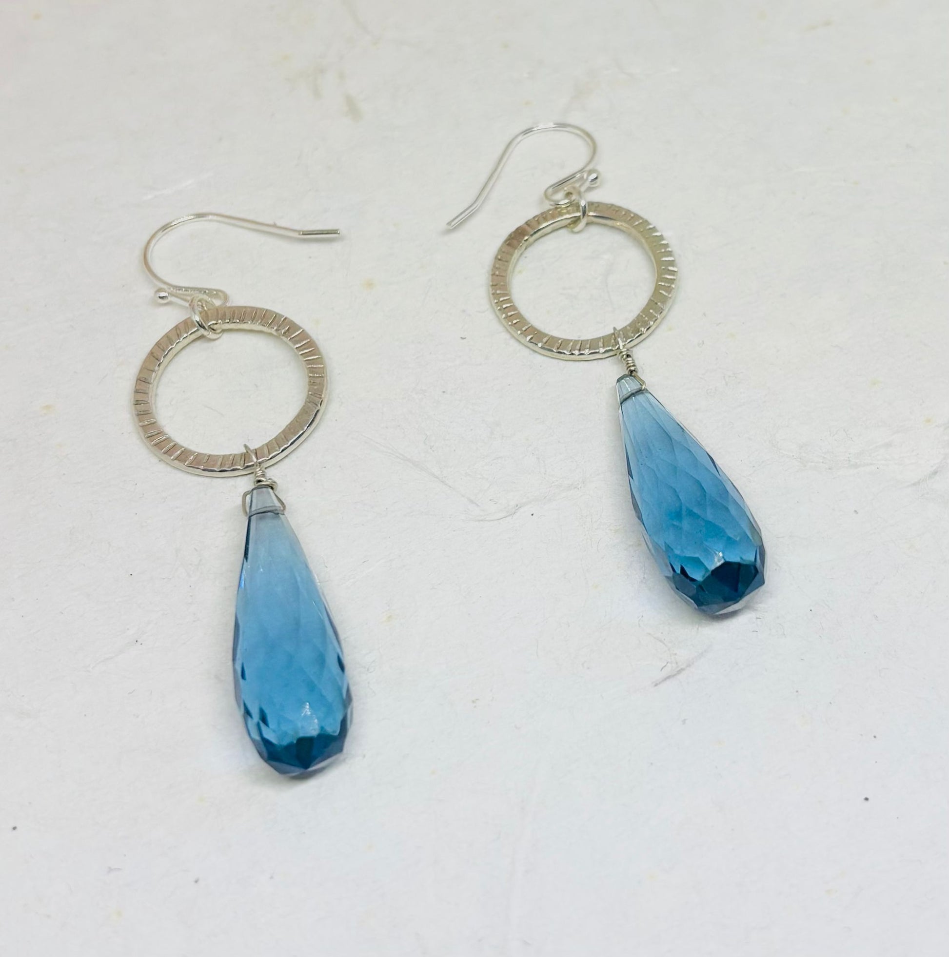 Zilveren oorbellen met een prachtige blauwe Kyaniet in druppelvorm, facet geslepen. Cirkel is bewerkt.